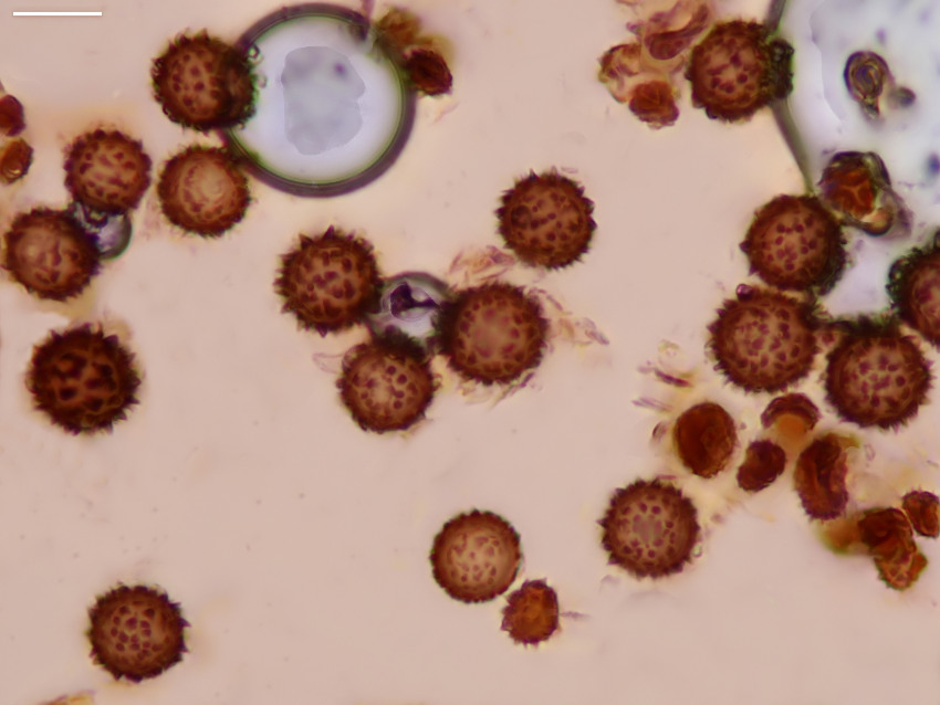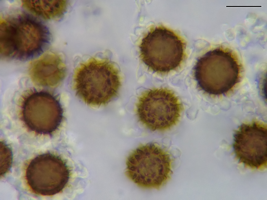 Scleroderma verrucosum, 16.09.2018, Dolnomoravský úval. Výtrusy s ostnitou ornamentikou. Zvětšení 1000× (imerze), voda, délka úsečky 10 µm.