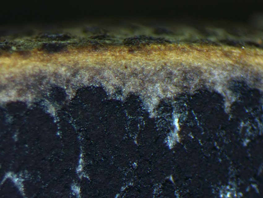 Scleroderma verrucosum, 14.02.2019, Kyjovská pahorkatina. Staré, zcela zčernalé a částečně plesnivé plodnice nalezeny na okraji intenzivně obdělávaného meruňkového sadu poblíž teplé dubohabřiny. Sub Armeniaca vulgaris. Nepředpokládám mykorhizu s meruňkou, spíše s kořeny stromů z cca 10 metrů vzdáleného okraje mladšího lesa (Quercus robur, Carpinus betulus, Tilia sp., Corylus avellana, přimíšen Larix decidua). Část výtrusů byla stále ve velmi dobrém stavu, makrovzhled starých plodnic rovněž odpovídal taxonu Scleroderma verrucosum. Zvětšení 1000× (imerze), kongočerveň, délka úsečky 10 µm.