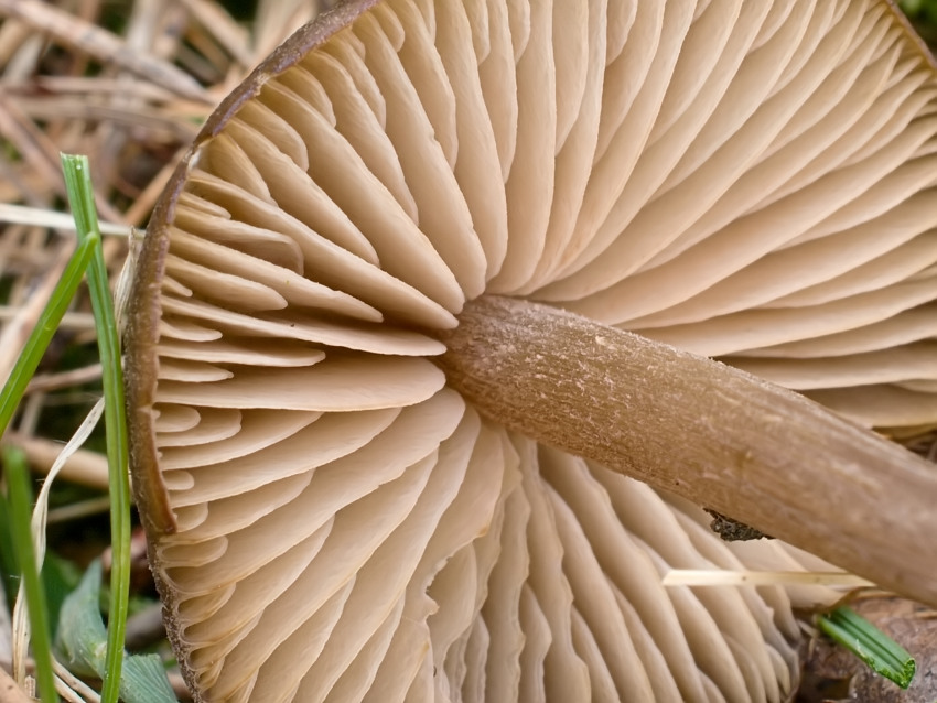 Entoloma vernum, 03.04.2021, Dolnomoravský úval. Detailní pohled do narůžovělých lupenů.
