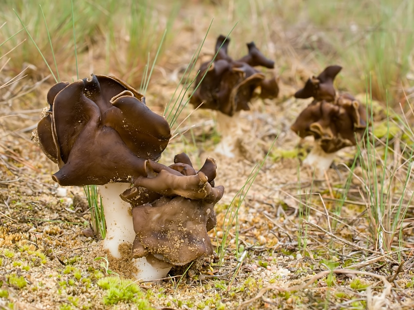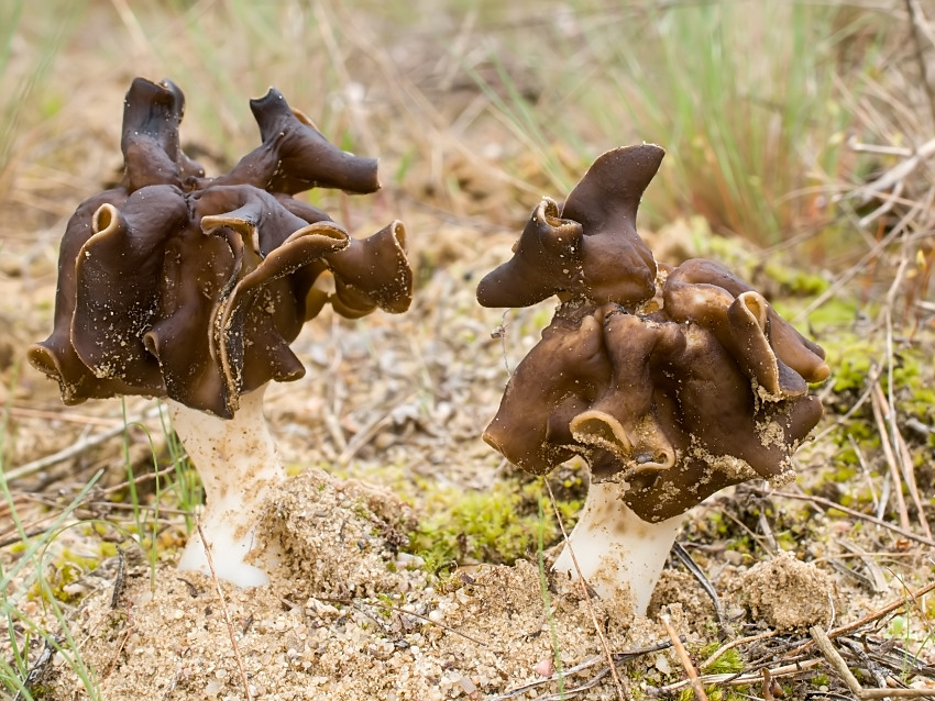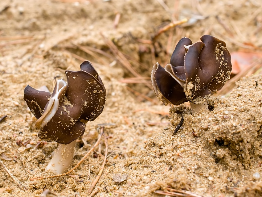 Helvella leucopus, 19.04.2024, Dolnomoravský úval. Asi 40 plodnic na ploše několika metrů čtverečných na čistě písečném podloží. Úzká světlina s velmi řídkou vegetací mezi borovými monokulturami, v blízkém okolí jednoletý až tříletý nálet Populus tremula.