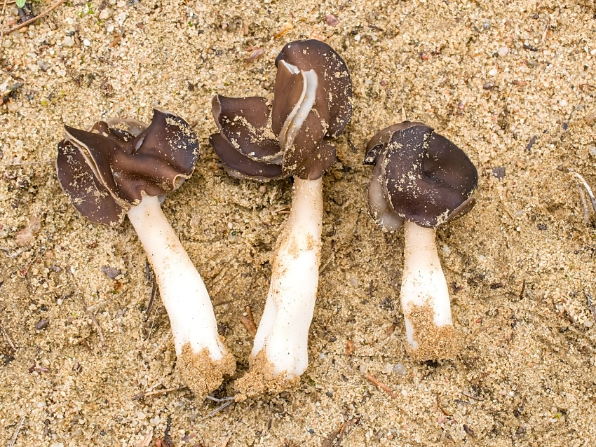 Helvella leucopus, 19.04.2024, Dolnomoravský úval. Lokalita jako výše. U všech plodnic byla minimálně polovina třeně schovaná v písku, v některých případech byla viditelná pouze plodná část.