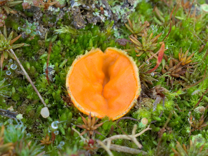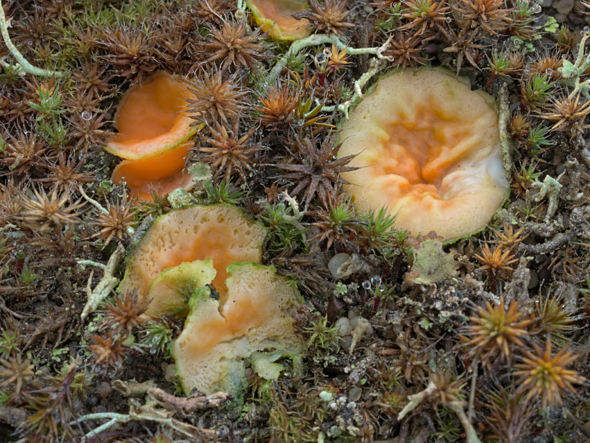 Neottiella vivida, 26.12.2015, Dolnomoravský úval. Otevřené kyselé písčité místo, v porostu Polytrichum sp. a Cladonia sp. Kromě čerstvých plodnic jsou zachyceny i staré oranžovobělavé plodnice.