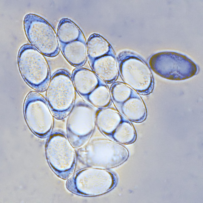 Neottiella vivida, mikrosnímek výtrusů exikátu z 26.12.2015. U některých výtrusů je dobře viditelná bradavčitá ornamentika. Zv. 400x, barveno bavlníkovou modří.