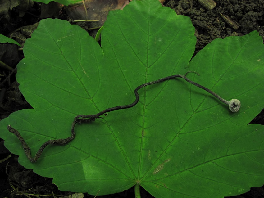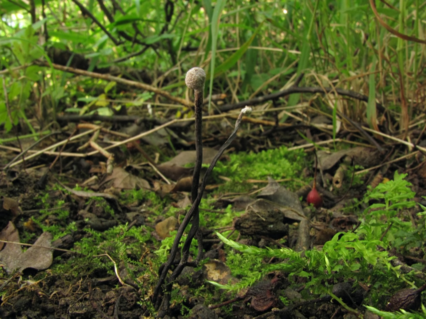 Ophiocordyceps entomorrhiza, 31.07.2016, CHKO Pálava. Stroma rostoucí na okraji lesní cesty v dubohabřině.