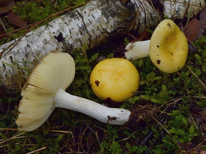 Russula claroflava, 08.09.2019, Dolnomoravský úval. Březový hájek na písku s přimíšenou Pinus sylvestris, v keřovém patře hojně Frangula alnus. Houby rostly v mechu na světlejších místech. Lokalita měla dříve vysokou spodní vodu, místy byla až podmáčená, v současnosti je víceméně vyschlá.
