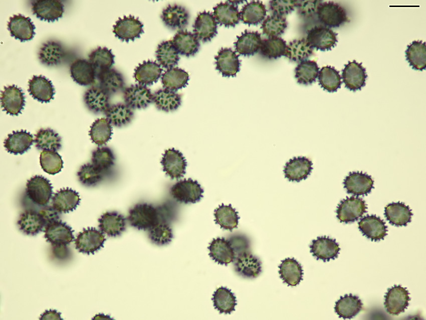 Russula claroflava, 08.09.2019, Dolnomoravský úval. Výtrusy s výraznou ornamentikou vysokou až kolem 1 µm. Zvětšení 1000× (imerze), Melzerovo činidlo, délka úsečky 10 µm.