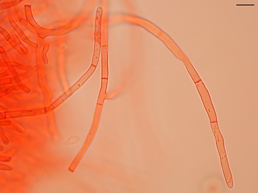 Russula claroflava, 08.09.2019, Dolnomoravský úval. Přehrádkované a inkrustované dermatocystidy v pokožce klobouku. Zvětšení 1000× (imerze), kongočerveň, délka úsečky 10 µm.