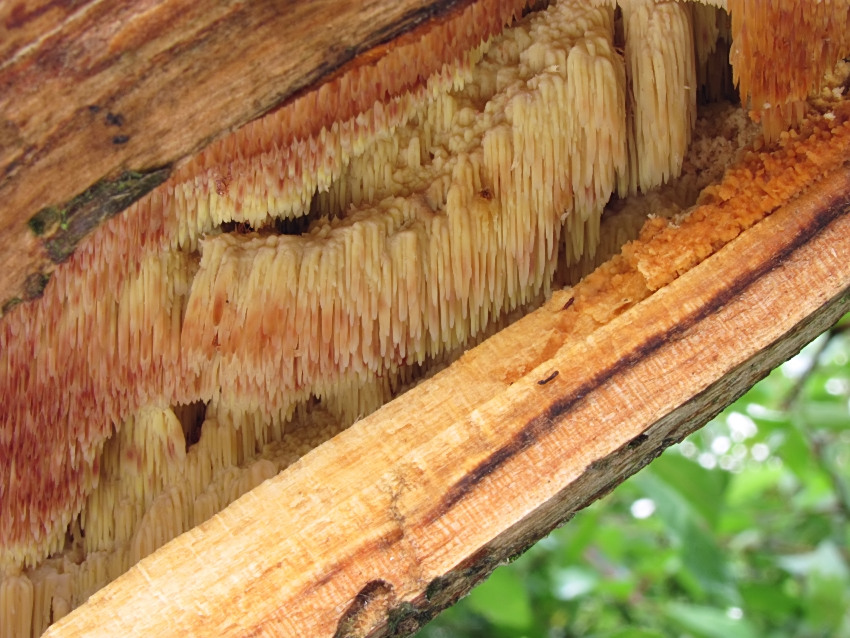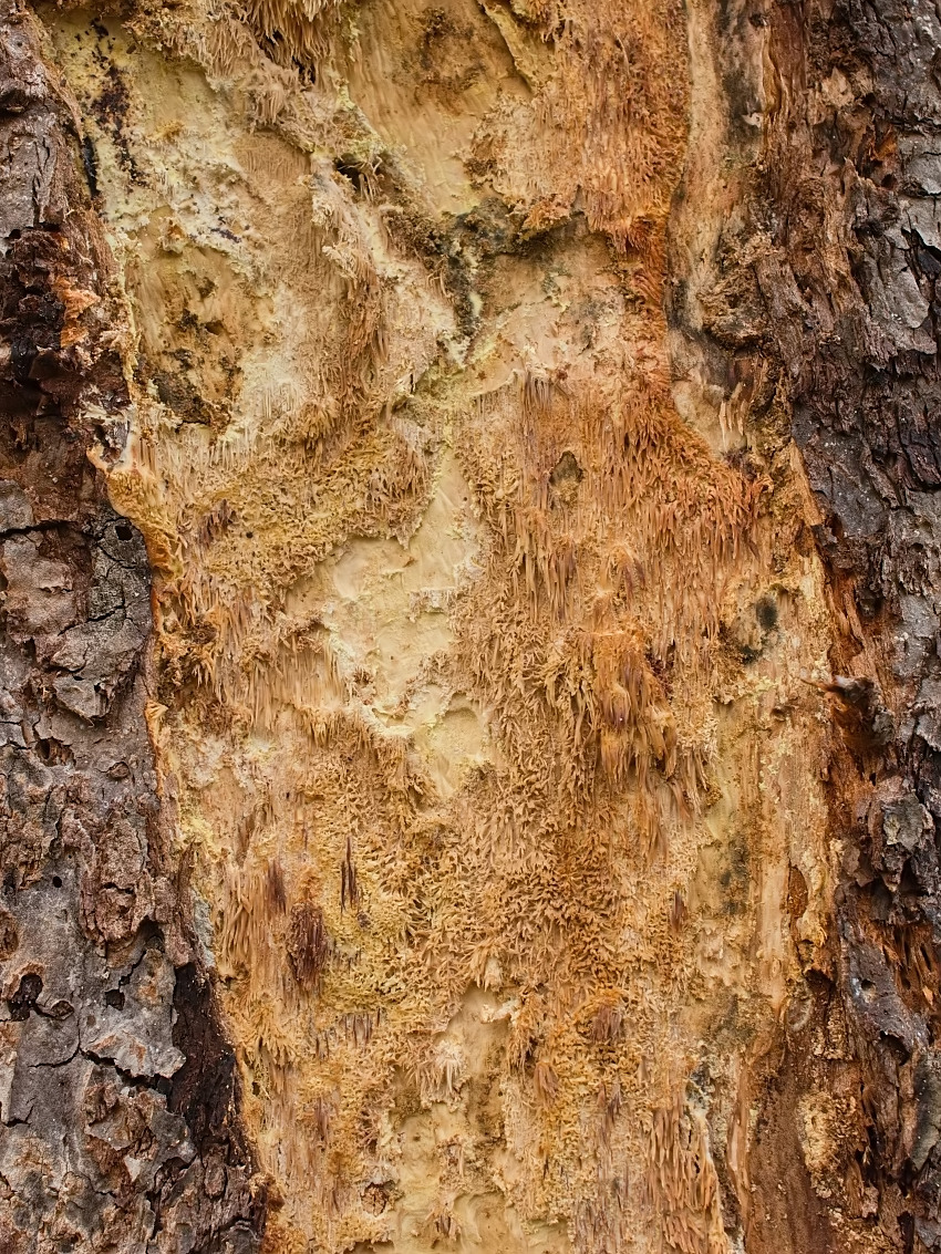 Sarcodontia crocea, 26.07.2012, Kyjovská pahorkatina. Vnitřní část ulomené větve na usychající jabloni, neobdělávaný jabloňový sad.