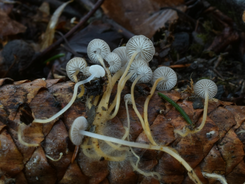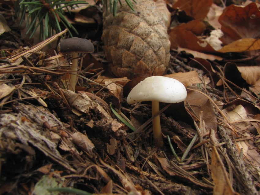 Strobilurus esculentus, 01.04.2012, CHKO Bílé Karpaty. Smrkový porost, šišky Picea abies. Kromě tisíců klasicky zbarvených plodnic nalezeno i několik albínů.