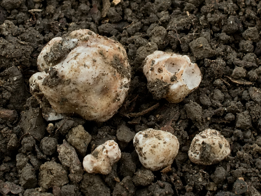 Tuber puberulum, 11.11.2018, CHKO Bílé Karpaty. Mladé až velmi plodnice z nichž největší má v průměru 13 mm. Listnatý les; sub Carpinus betulus, Tilia sp.; poblíž ještě Quercus robur.
