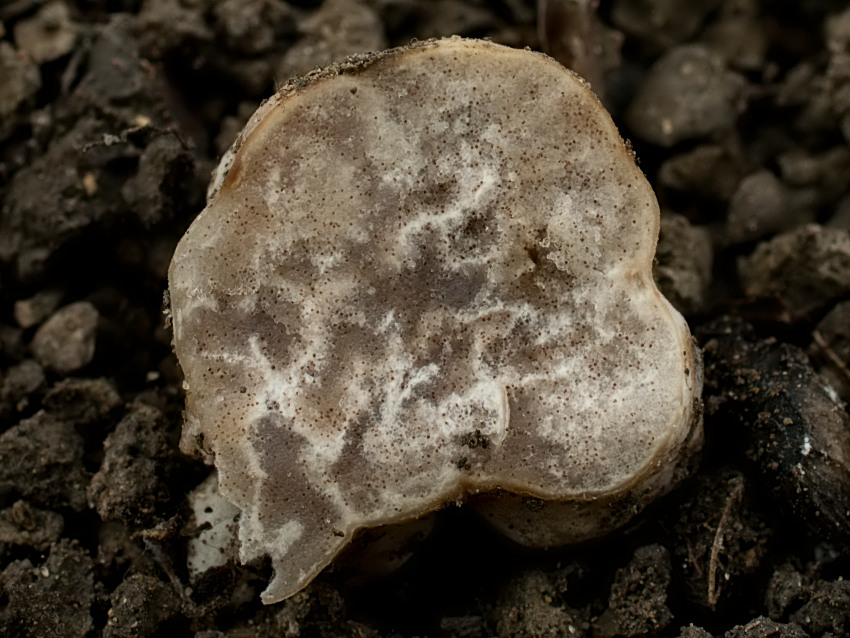 Tuber puberulum, 11.11.2018, CHKO Bílé Karpaty. Řez největší plodnicí z horního snímku. Drobná tmavá zrníčka jsou zralé výtrusy.