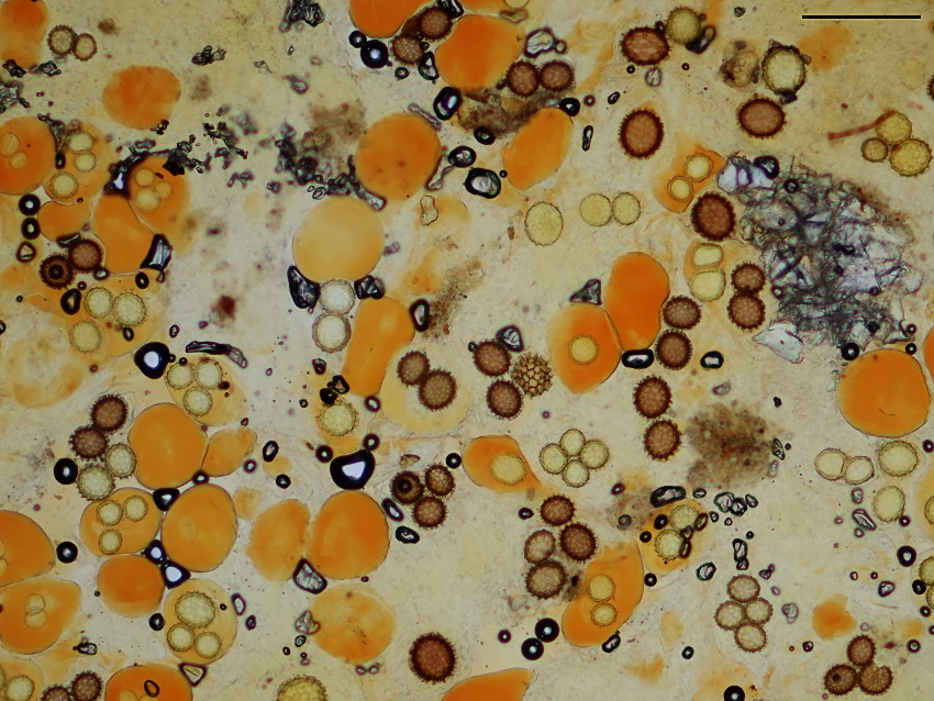 Tuber puberulum, 11.11.2018, CHKO Bílé Karpaty. Hymenium s různě starými vřecky a výtrusy. Zvětšení 100×, Melzerovo činidlo, délka úsečky 100 µm.