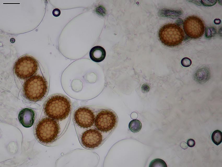 Tuber puberulum, 11.11.2018, CHKO Bílé Karpaty. Výtrusy s výraznou retikulátní ornamentikou. Zvětšení 400×, voda, délka úsečky 20 µm.